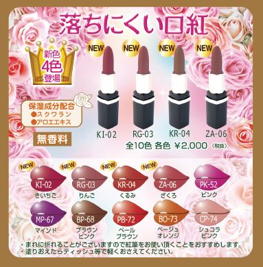 さて、この度弊社ではミクキ ピュアラブルージュ廃番に伴い、代替え商品として落ちにくい口紅新色4色を発売いたします。