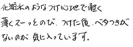 化粧水のようなつけ心地で軽く薄くスーッとのび、つけた後、ベタつきがないのが気に入っています。