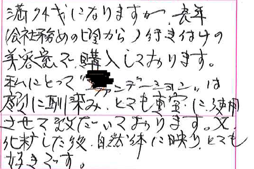 満74才になりますが、長年(会社勤めの頃から)行きつけの美容室で購入しております。私にとってファンデーションは顔に馴染み、とても重宝させて頂いております。また化粧した後、自然体に映りとても好きです。