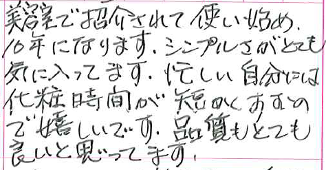 美容室で紹介されて使い始め10年になります。シンプルさがとても気に入ってます。忙しい自分には化粧時間が短く済むので嬉しいです。品質もとても良いと思ってます。