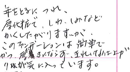 年をとるにつれ、厚化粧で、しわ・しみなど隠したがりますが、このファンデーションは簡単でかつ厚付きにならず、きれいな仕上がりが気に入っています。
