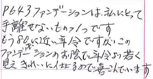 P643ファンデーションは私にとって手離せないものの一つです。もう80才近い年齢ですが、このファンデーションのお陰で年齢より若く見え、きれいに仕上がるので喜んでいます。