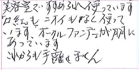 美容室ですすめられて使っています。口紅もニオイもなく使っています。オークルファンデが肌に合っています。これからも手離せません。