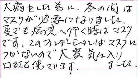 大病をした為に冬の間はマスクが必要になりました。夏でも病院へ行く時はマスクです。このファンデーションはマスクにつかないので大変気に入りました。口紅も使っています。