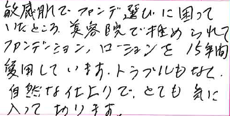 敏感肌でファンデ選びに困っていたところ、美容室ですすめられてファンデーション・ローションを15年間愛用しています。トラブルもなく自然な仕上がりでとても気に入っております。